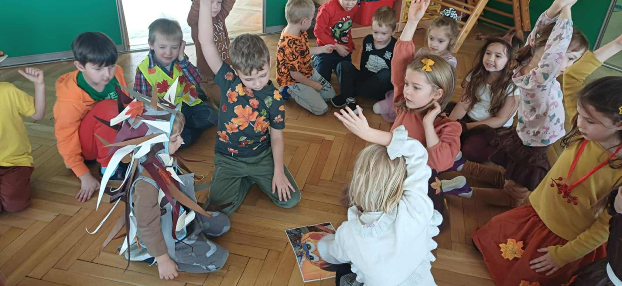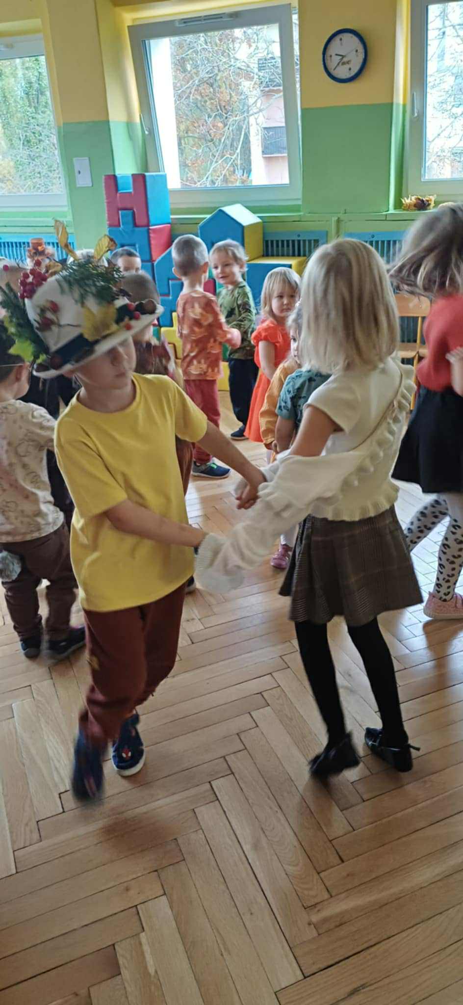 Grupa Żabek uczestniczyła w balu jesieni. Układaliśmy jesienne puzzle, były ćwiczenia zręcznościowe w podawaniu dyni, a także taniec jesiennych liści.