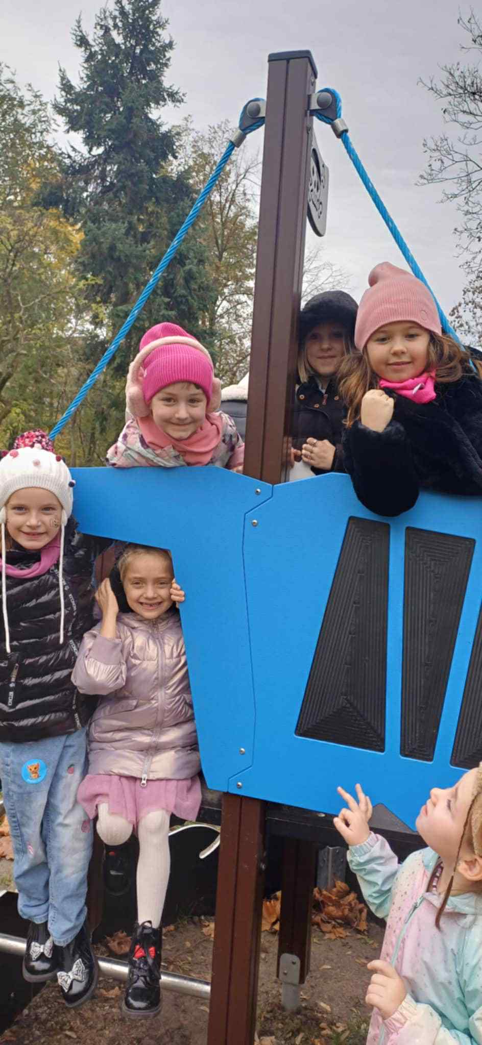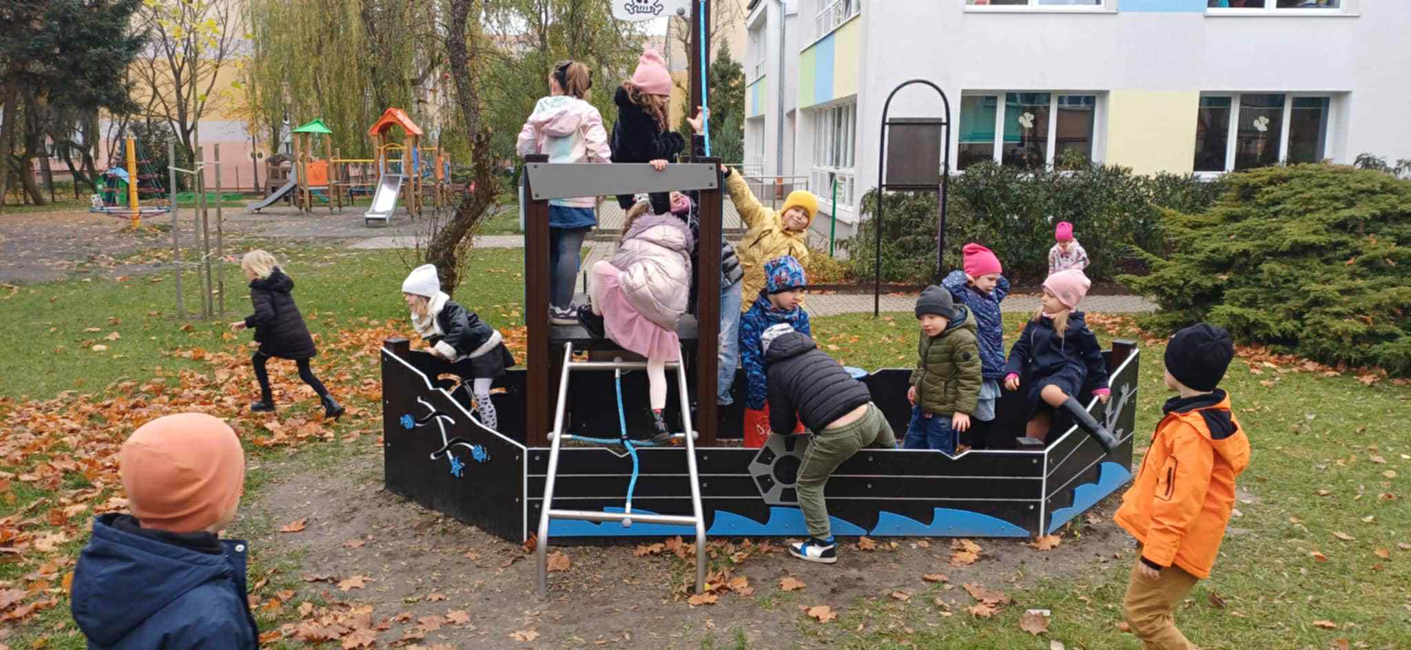 Zabawy na statku- nowej atrakcji w ogrodzie przedszkolnym zrealizowanej z wygranej w akcji "Rowerowy maj".