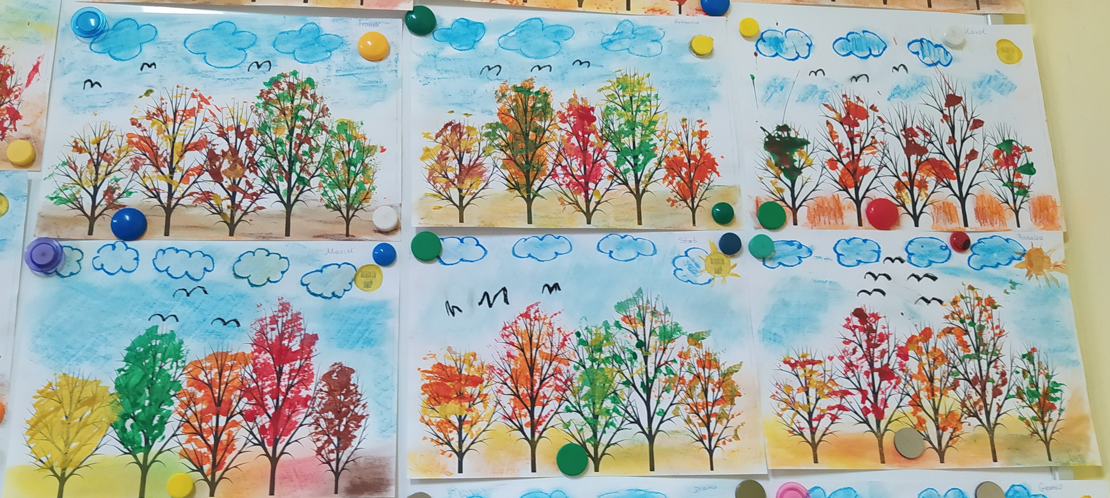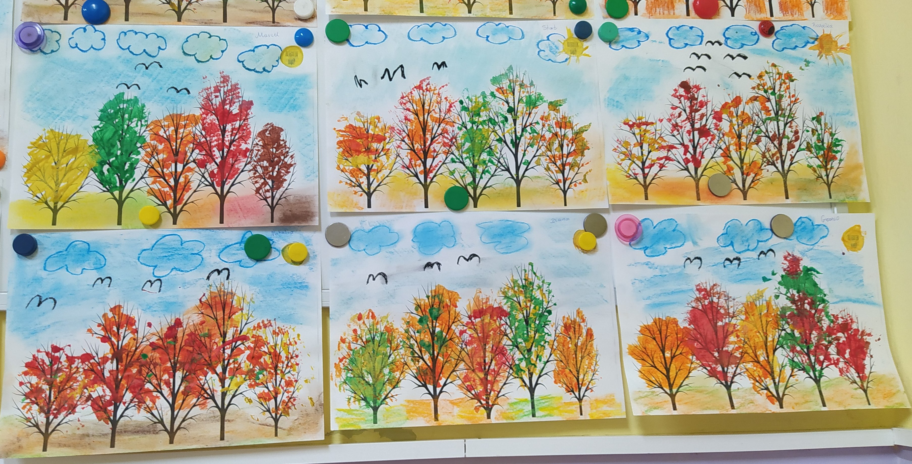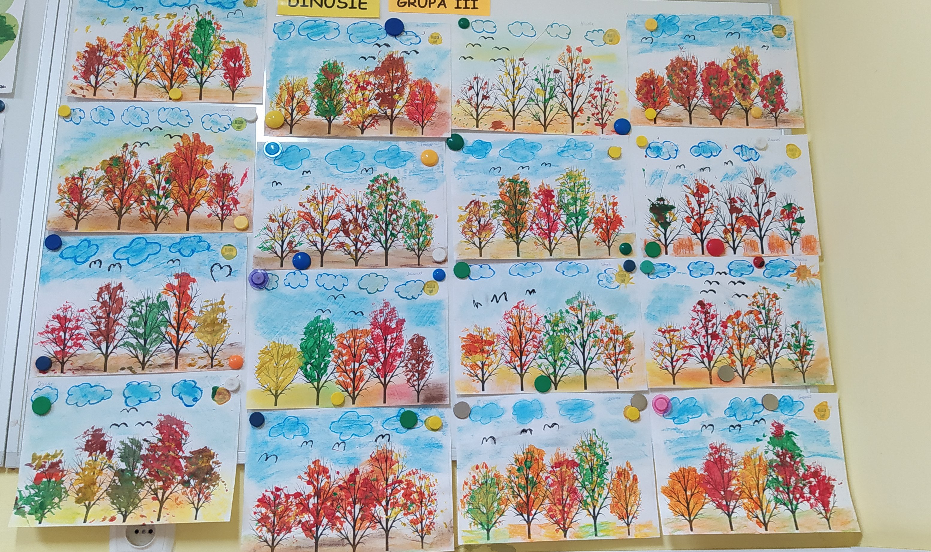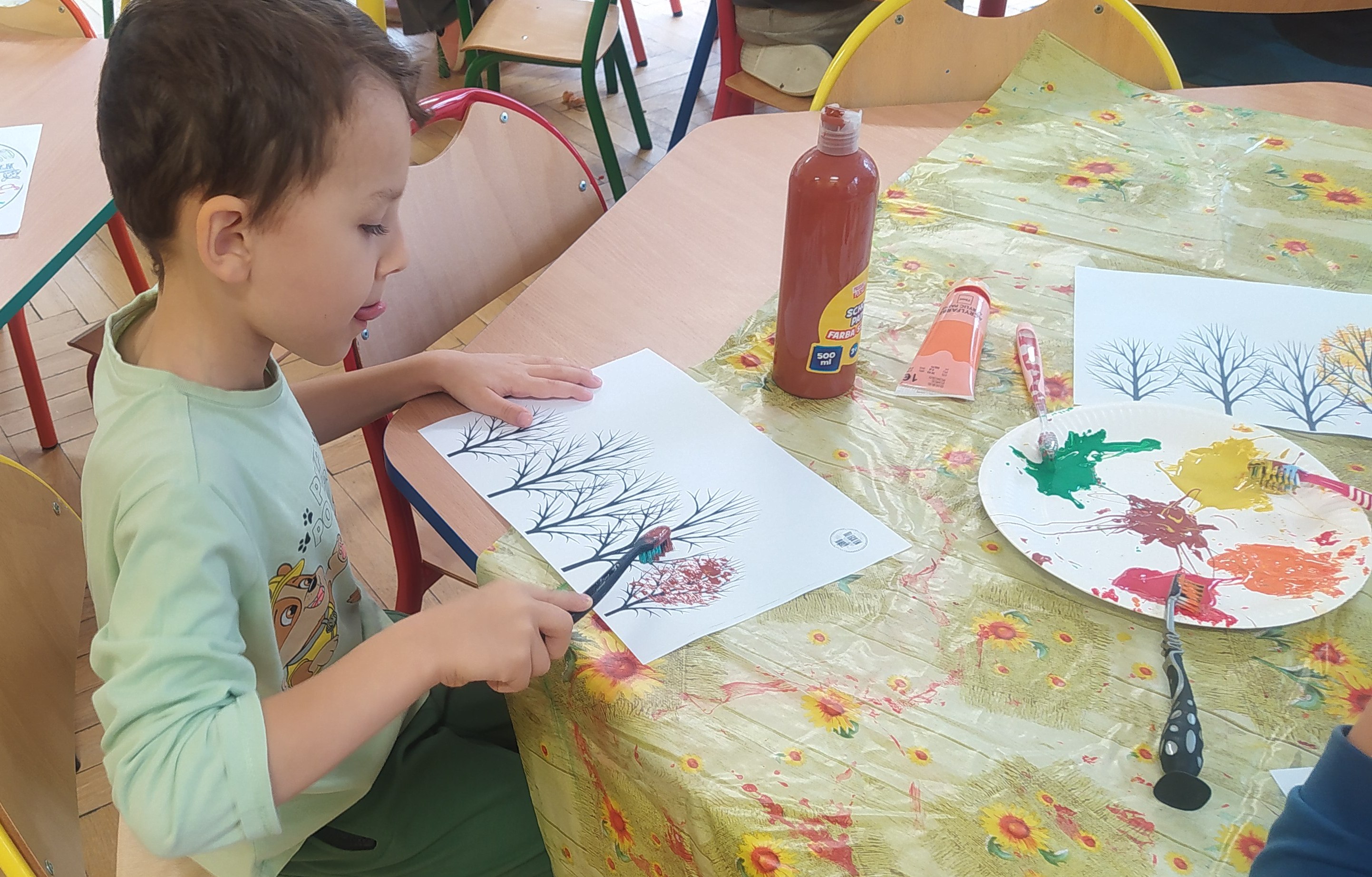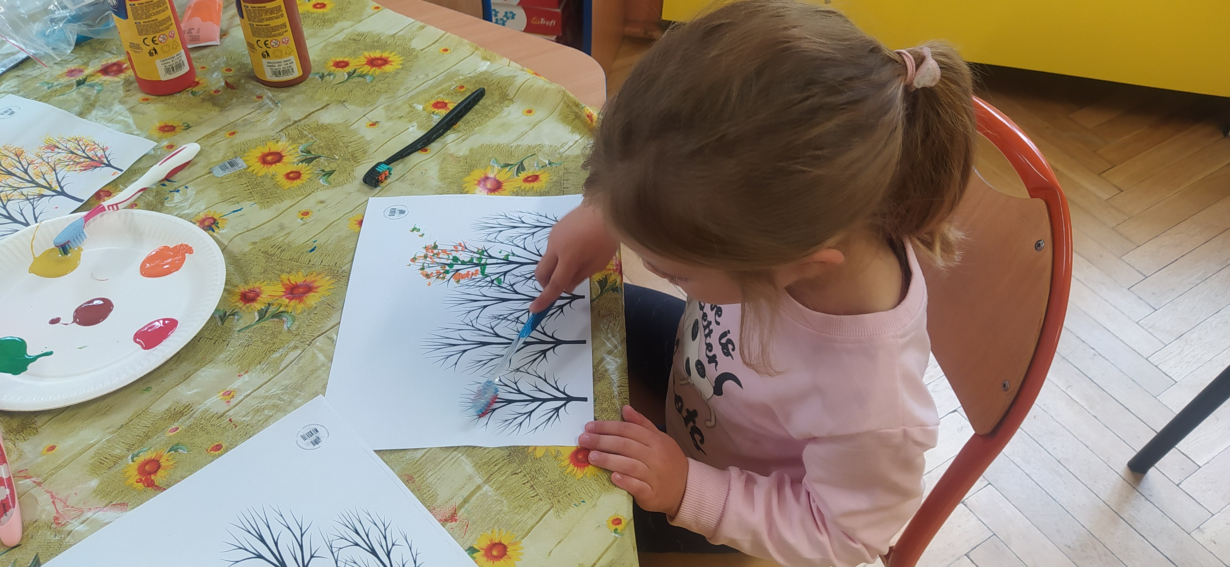 W naszej grupie podczas zajęć plastycznych przedszkolaki tworzyły swoje własne, kolorowe obrazy jesiennego lasu wykorzystując nietypowe narzędzie - szczoteczki do zębów. Dzieci eksperymentowały z rozcieraniem farby szczoteczką, tworząc barwne korony drzew i liście w odcieniach jesieni.