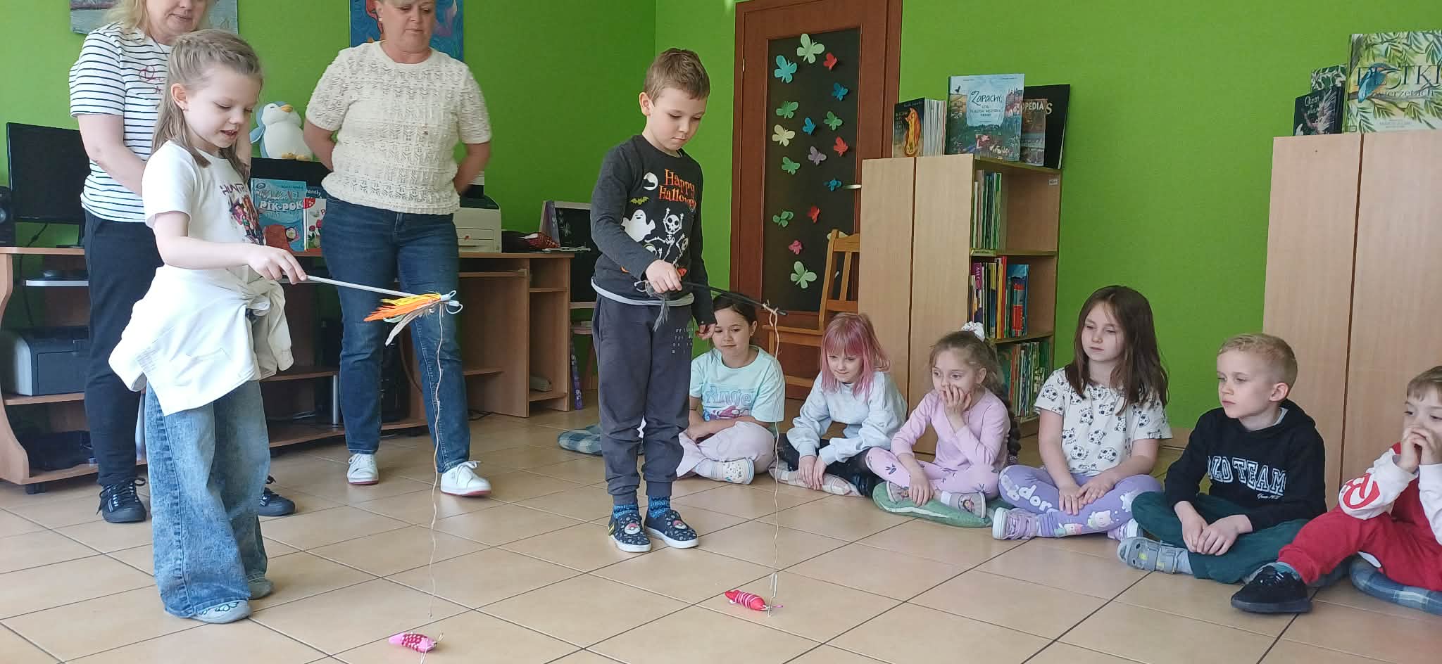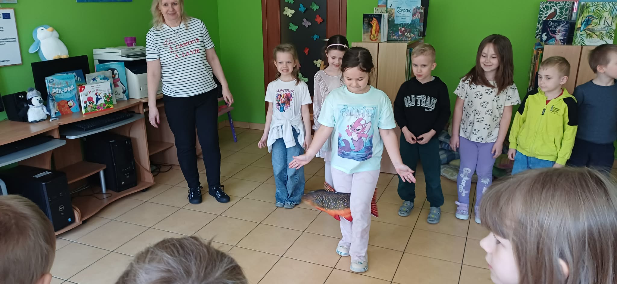 Dnia 17.04.26 grupa Żabek wybrała sie na kolejne zajęcia do biblioteki.W związku ze światowym dniem pingwina który bedzie 25.04.26 Pani Anetka przeczytała Nam książkę o pingwinku, przekazywalismy sobie rybkę w ramach zabawy ruchowej, układaliśmy zadania tekstowe a także łowiliśmy rybki wędka.Bardzo dziękujemy!