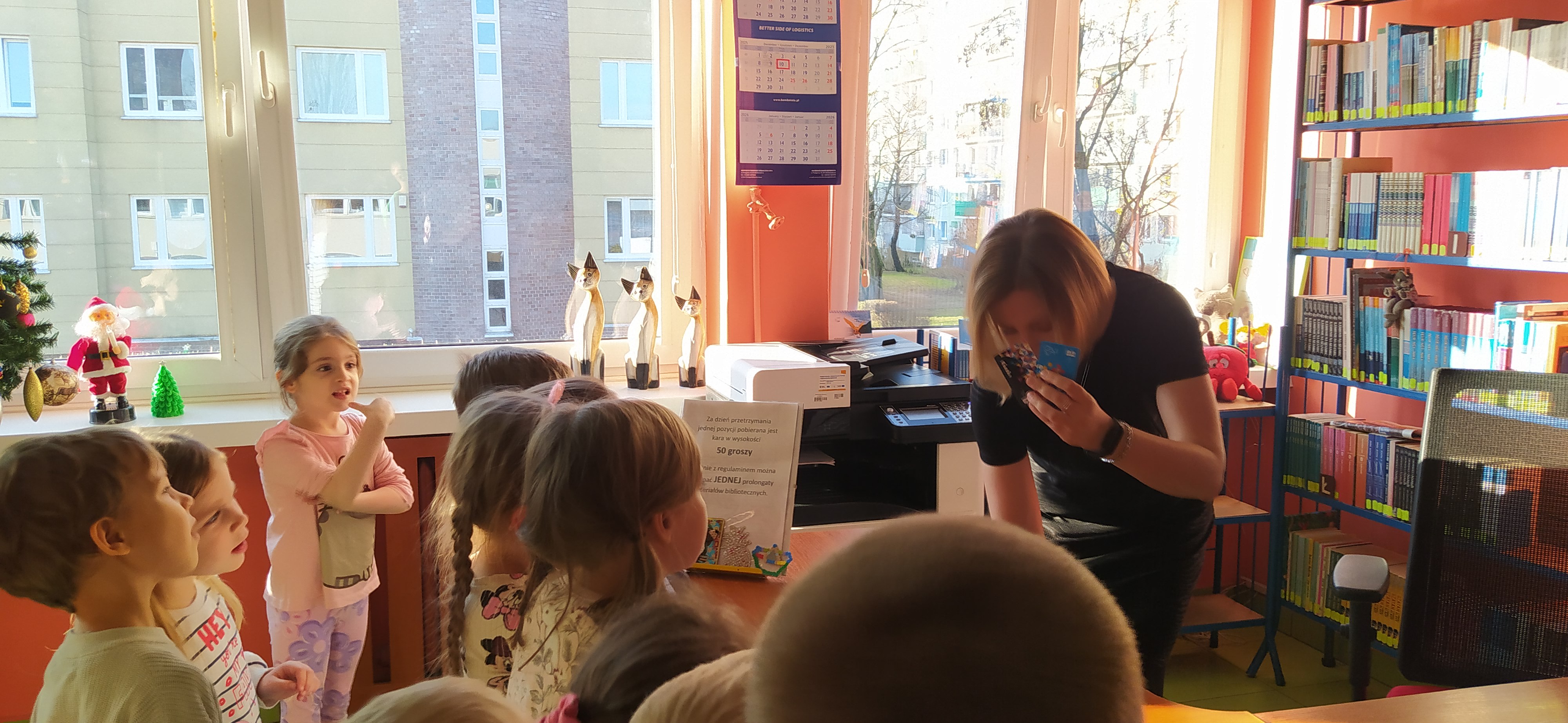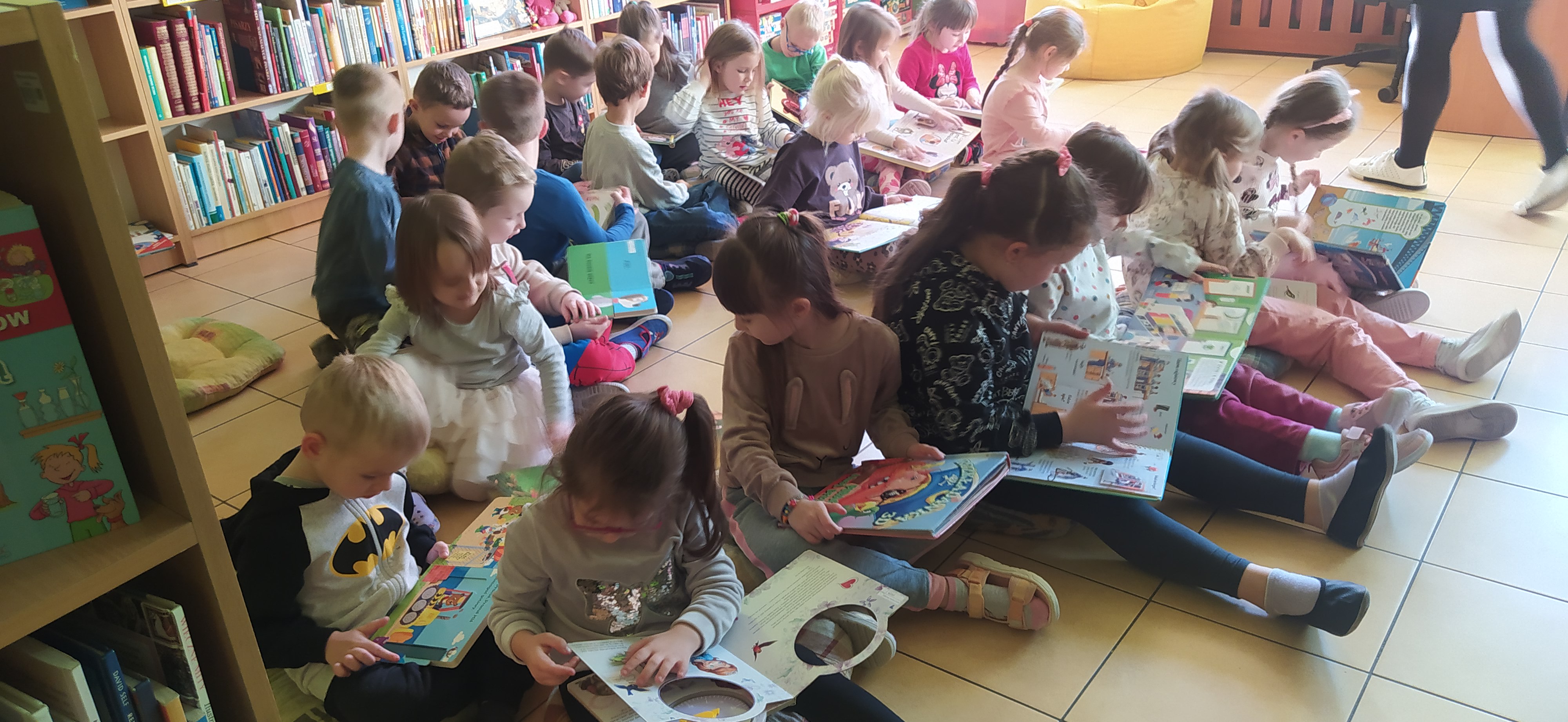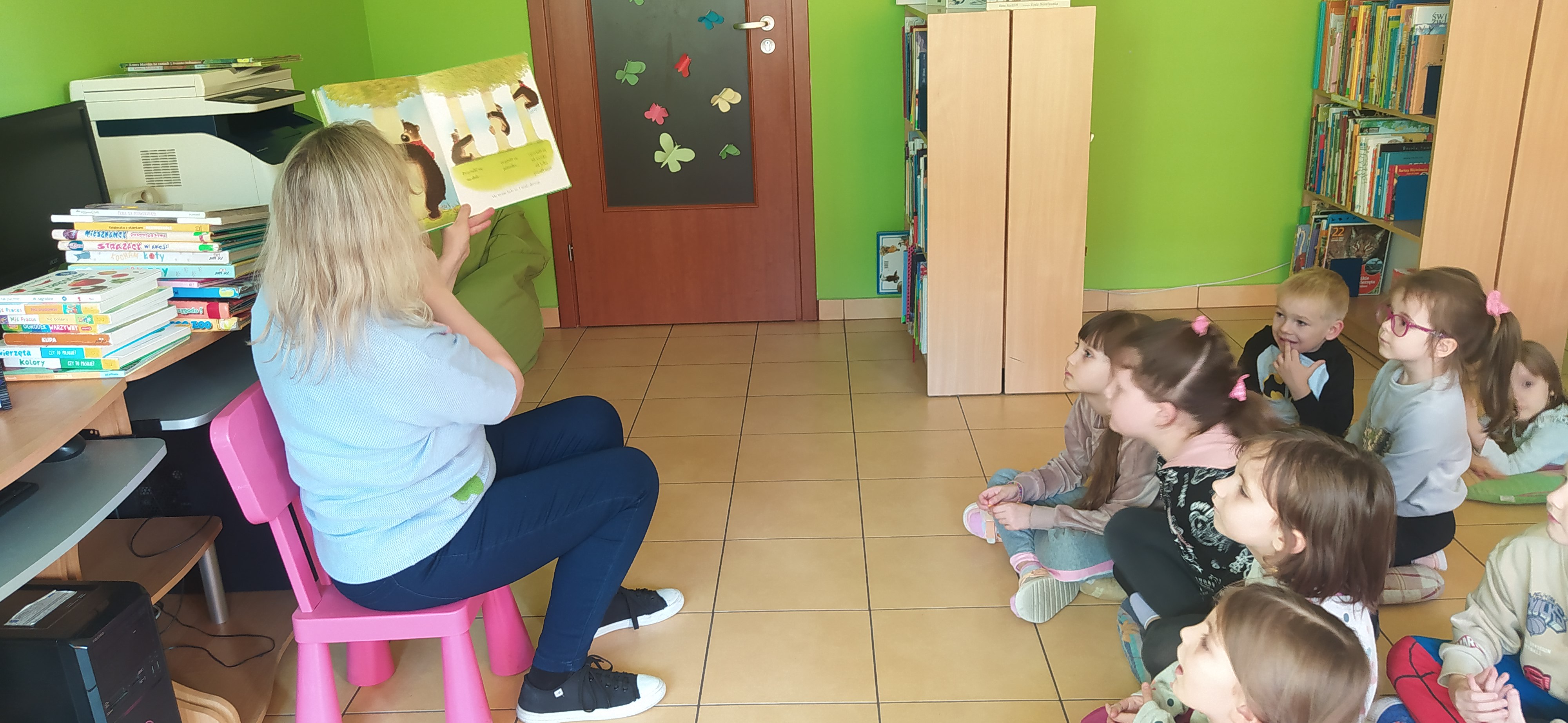 Przedszkolaki uczestniczyły w zajęciach w bibliotece. Zwiedzały jej wnętrze, poznały pracę bibliotekarza oraz zasady korzystania z biblioteki. Panie prezentowały różne książki, a dzieci miały również możliwość samodzielnego oglądania i przeglądania wybranych pozycji.