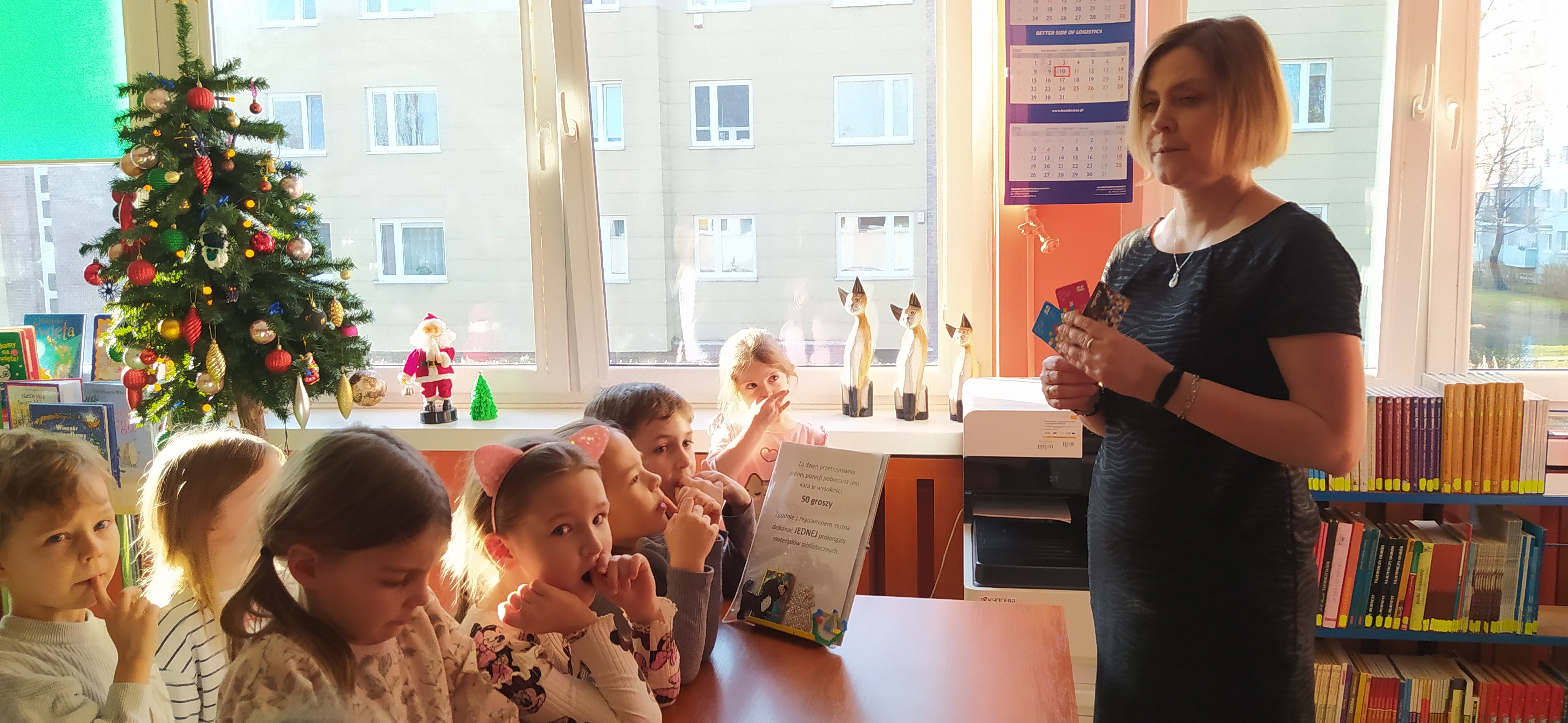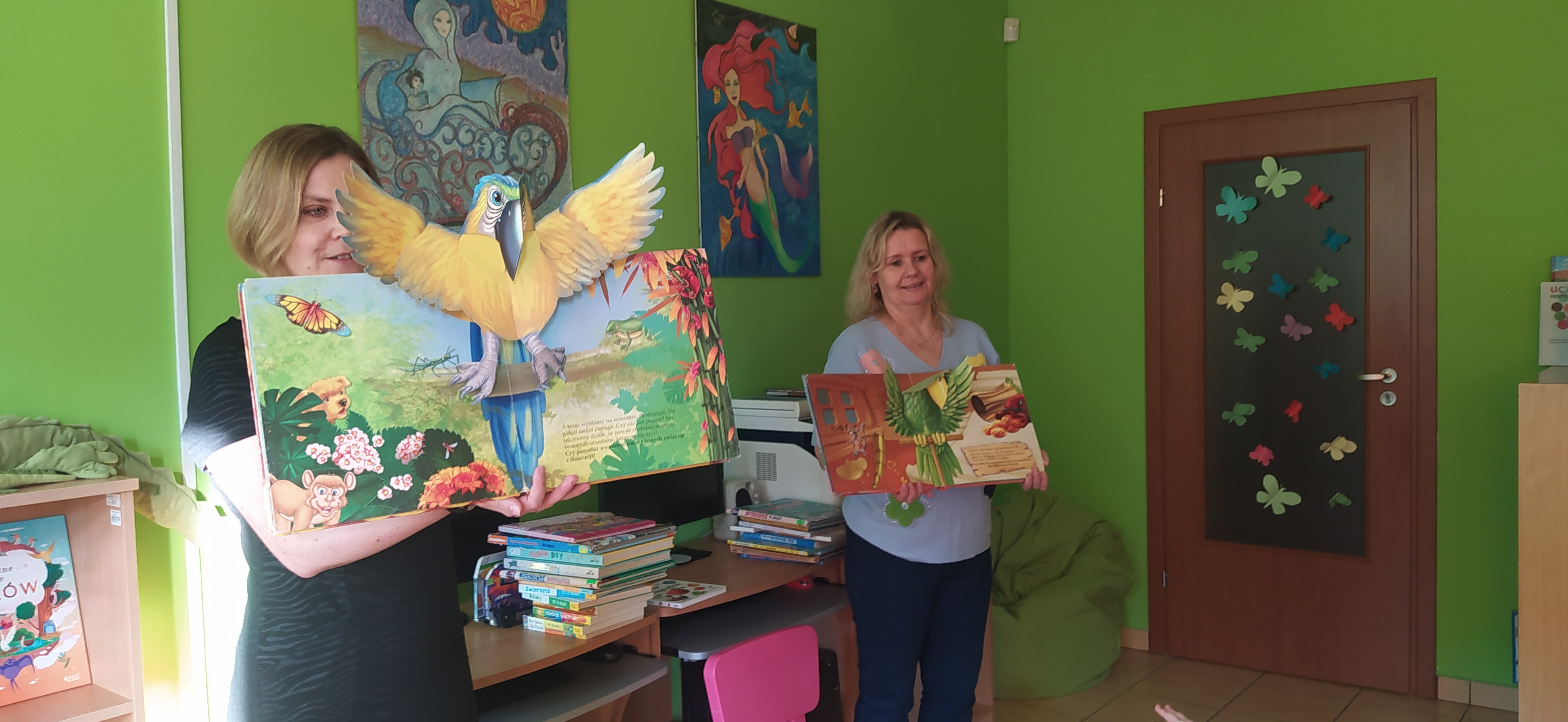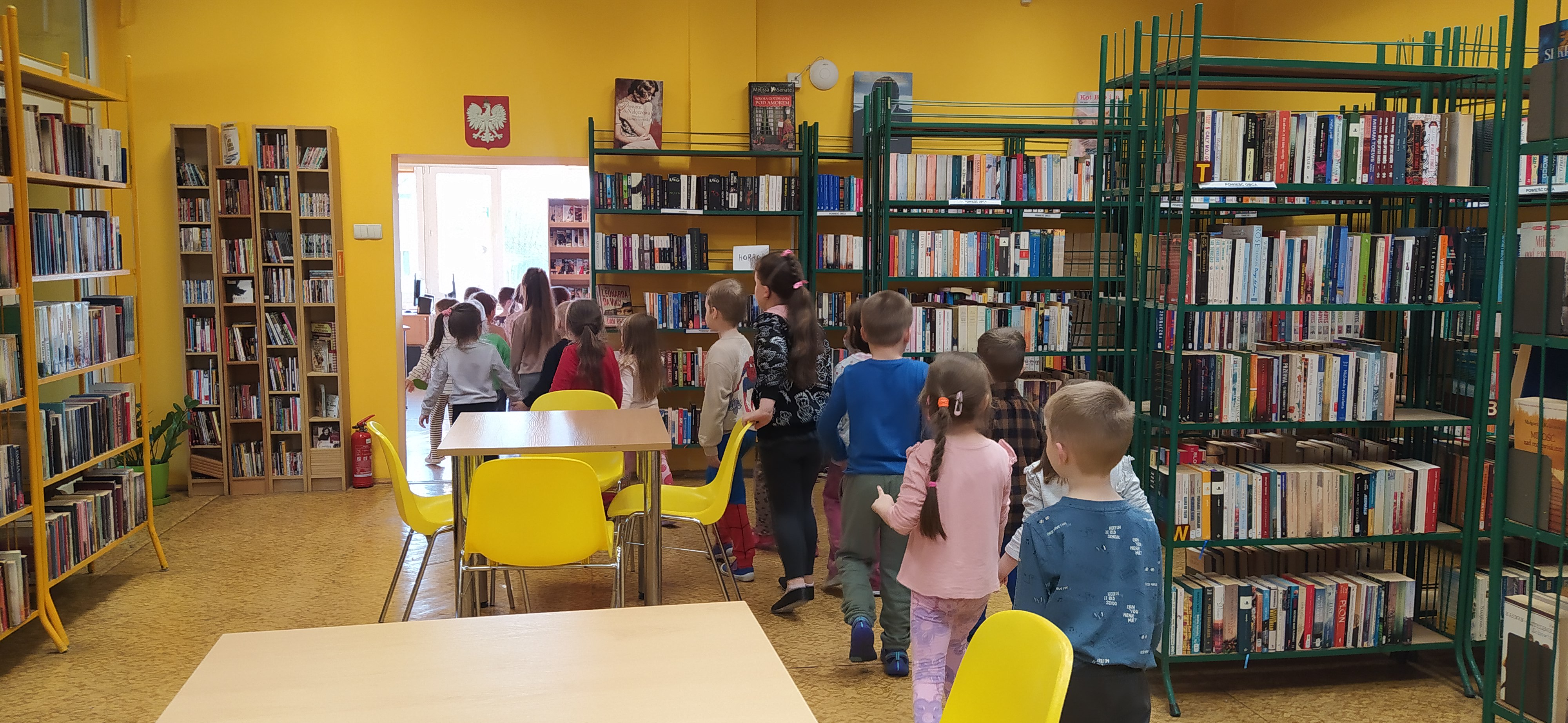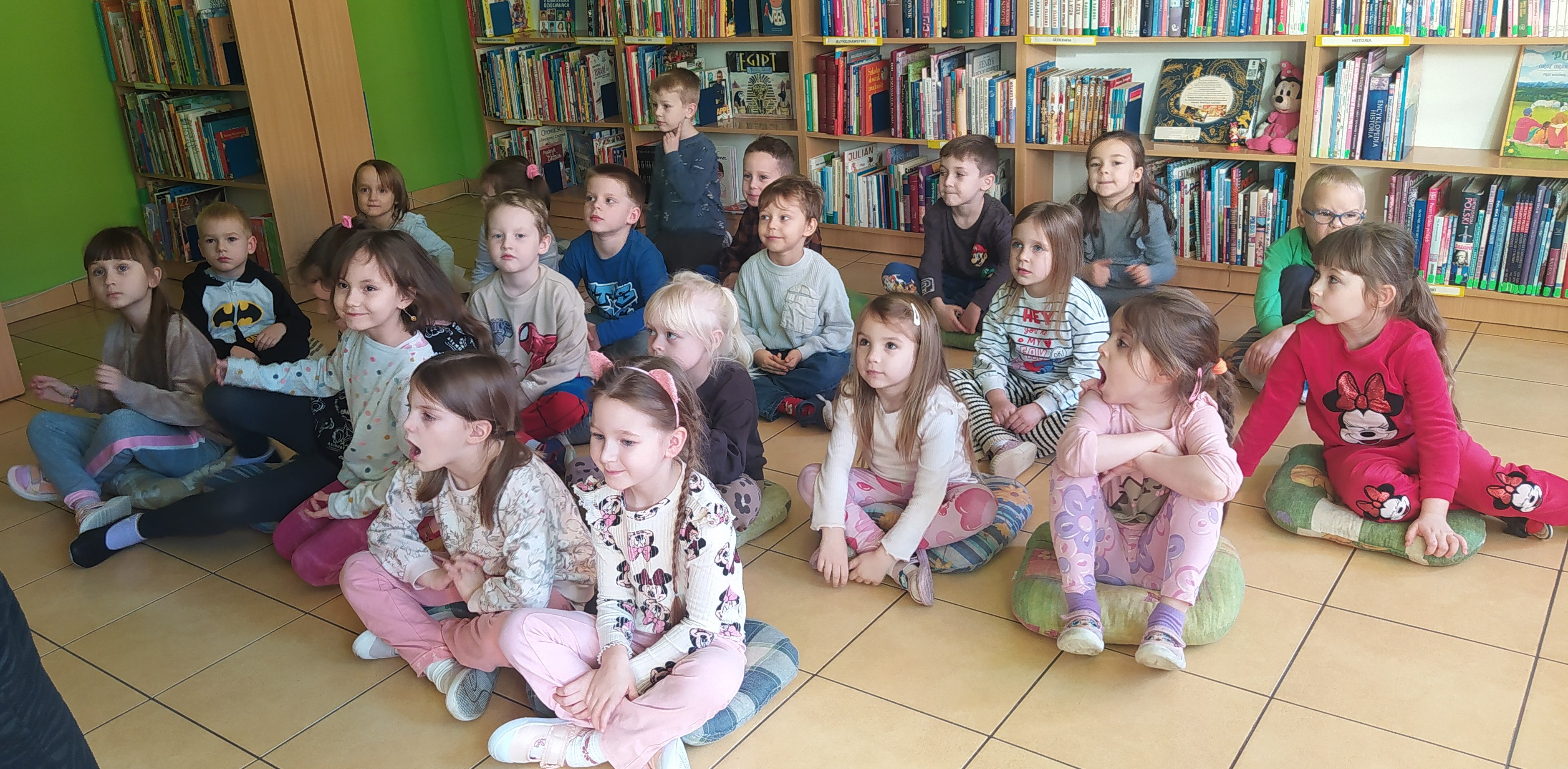 Przedszkolaki uczestniczyły w zajęciach w bibliotece. Zwiedzały jej wnętrze, poznały pracę bibliotekarza oraz zasady korzystania z biblioteki. Panie prezentowały różne książki, a dzieci miały również możliwość samodzielnego oglądania i przeglądania wybranych pozycji.