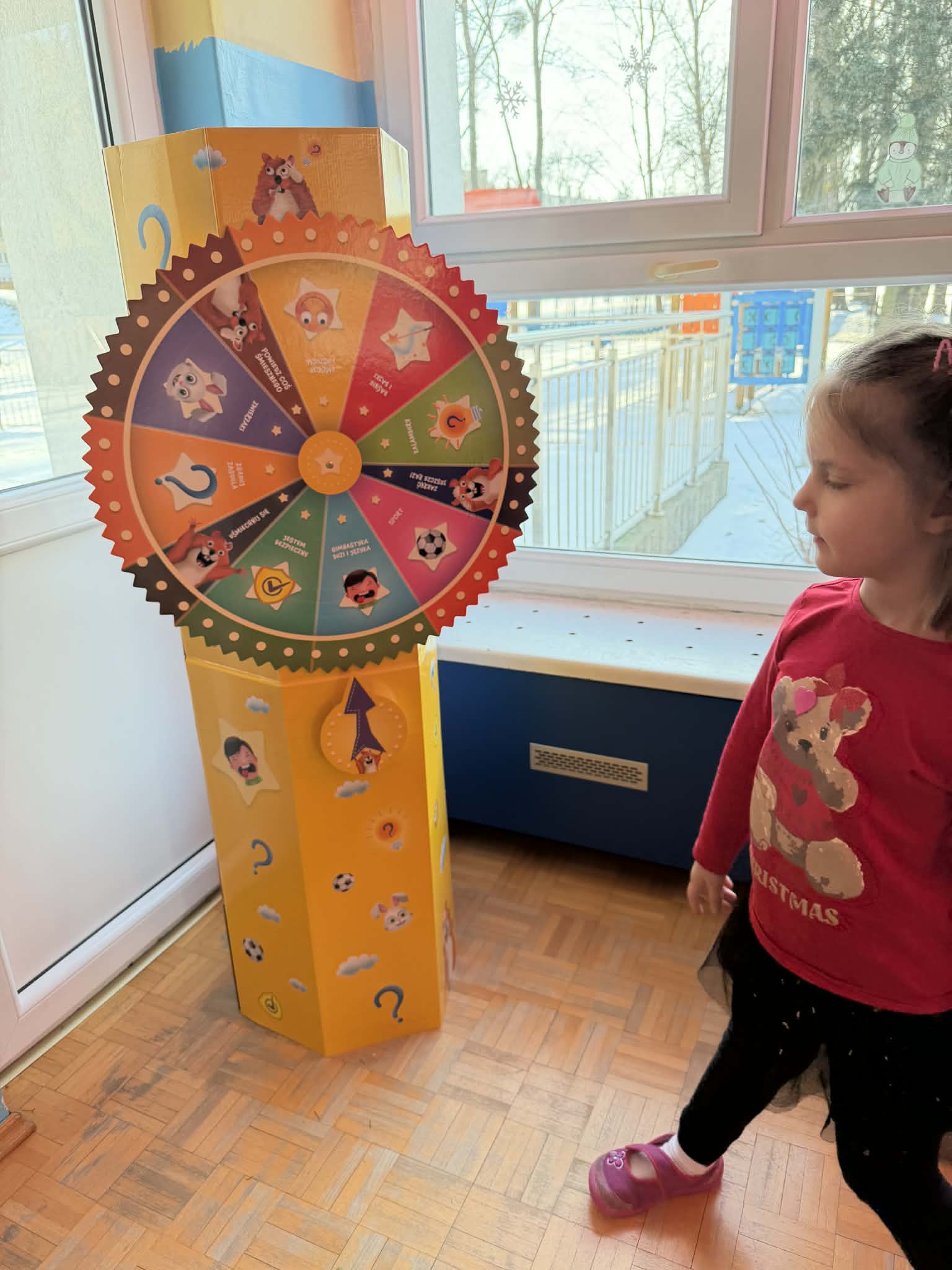 Grupa Kotków otrzymała pomoc dydaktyczną w postaci „koła fortuny”. Uwielbiamy się nią bawić, rozwija ona myślenie oraz wyobraźnię :)